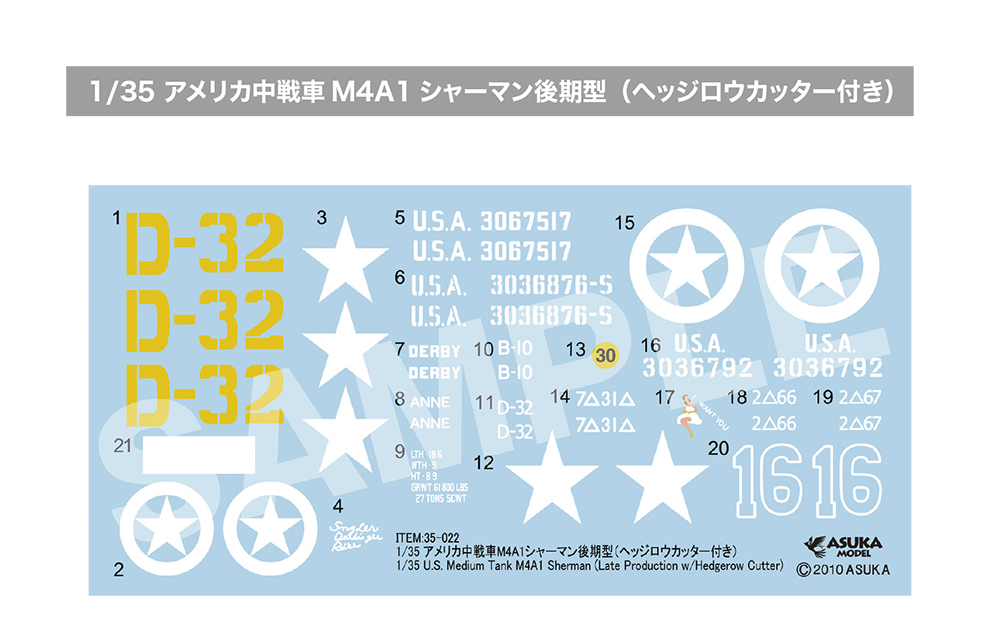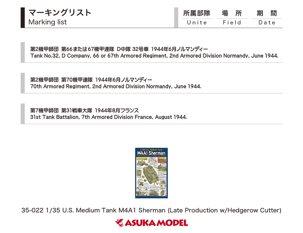 1/35 U.S. Medium Tank M4A1 Sherman (Late Production w/Hedgerow Cutter) #35-022