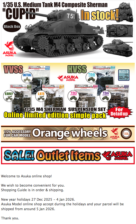 Asuka Model online shop accept during the holidays and your parcel will be shipped from around 5 Jan 2026.