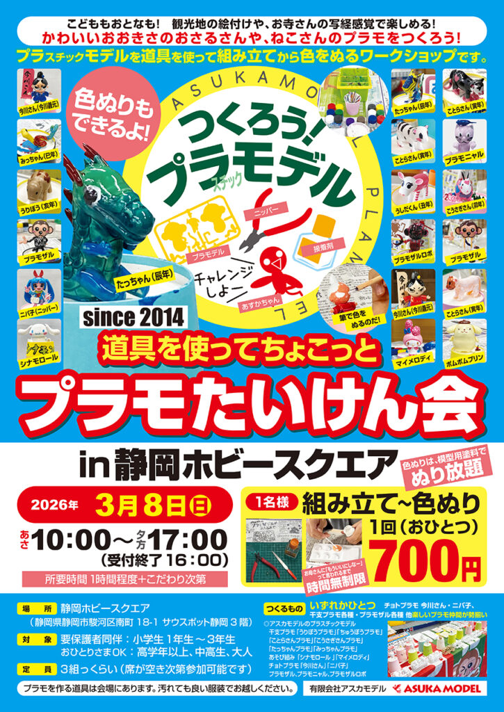 つくるもの : 手のひらサイズのプラモ(プラスチックモデル)いずれかひとつ(ねずみ・うさぎ・とらなどの干支プラモ、プラモザル各種(さる)チョトプラモ今川さんなど)Aコース 組み立てまで(所要時間30分程度)